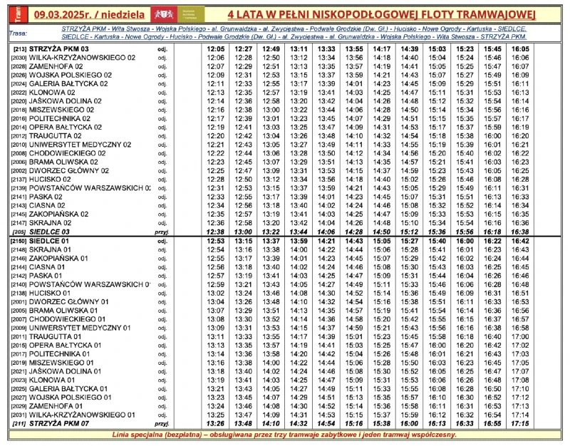 Linia specjalna będzie funkcjonować na trasie Strzyża PKM – Siedlce w godzinach 12:05 – 17:15. Kluczowe przystanki obejmują m.in. Galerię Bałtycką, Politechnikę Gdańską, Operę Bałtycką oraz Dworzec Główny. Szczegółowy rozkład dostępny jest poniżej.