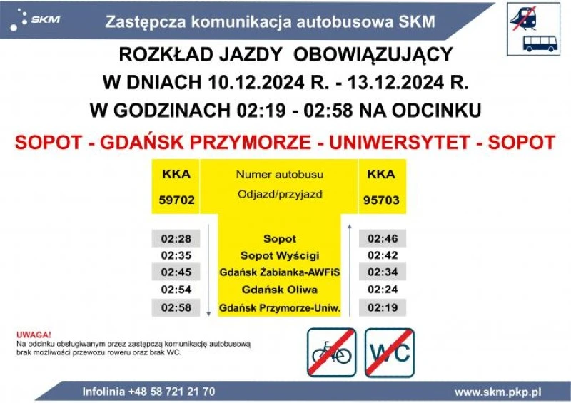 PKP Szybka Kolej Miejska w Trójmieście poinformowała, że w związku z pracami serwisowymi na trasie Sopot – Gdańsk Przymorze-Uniwersytet, w dniach od 10 do 13 grudnia 2024 r. za dwa nocne pociągi zostanie uruchomiona zastępcza komunikacja autobusowa SKM.