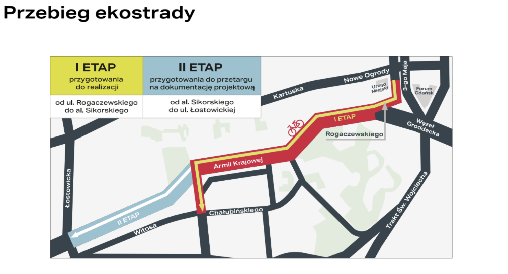 II etap trasy, czyli odcinek do ulicy Łostowickiej ma zostać wybudowany później. Dyrekcja Rozbudowy Miasta Gdańska ogłosiła już przetarg na projekt, zaś jeszcze w tym roku ma zostać wybrany jego wykonawca.