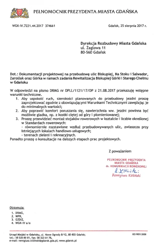 Postanowiliśmy zbadać sprawę głębiej i wystosować oficjalne zapytania do Pełnomocnika Prezydenta Gdańska ds. Komunikacji Rowerowej, Remigiusza Kitlińskiego. W odpowiedzi otrzymaliśmy wstępne uzgodnienia techniczne podczas rewitalizacji Biskupiej Górki. Jakie warunki dla planowanej przebudowy wydał oficer rowerowy?