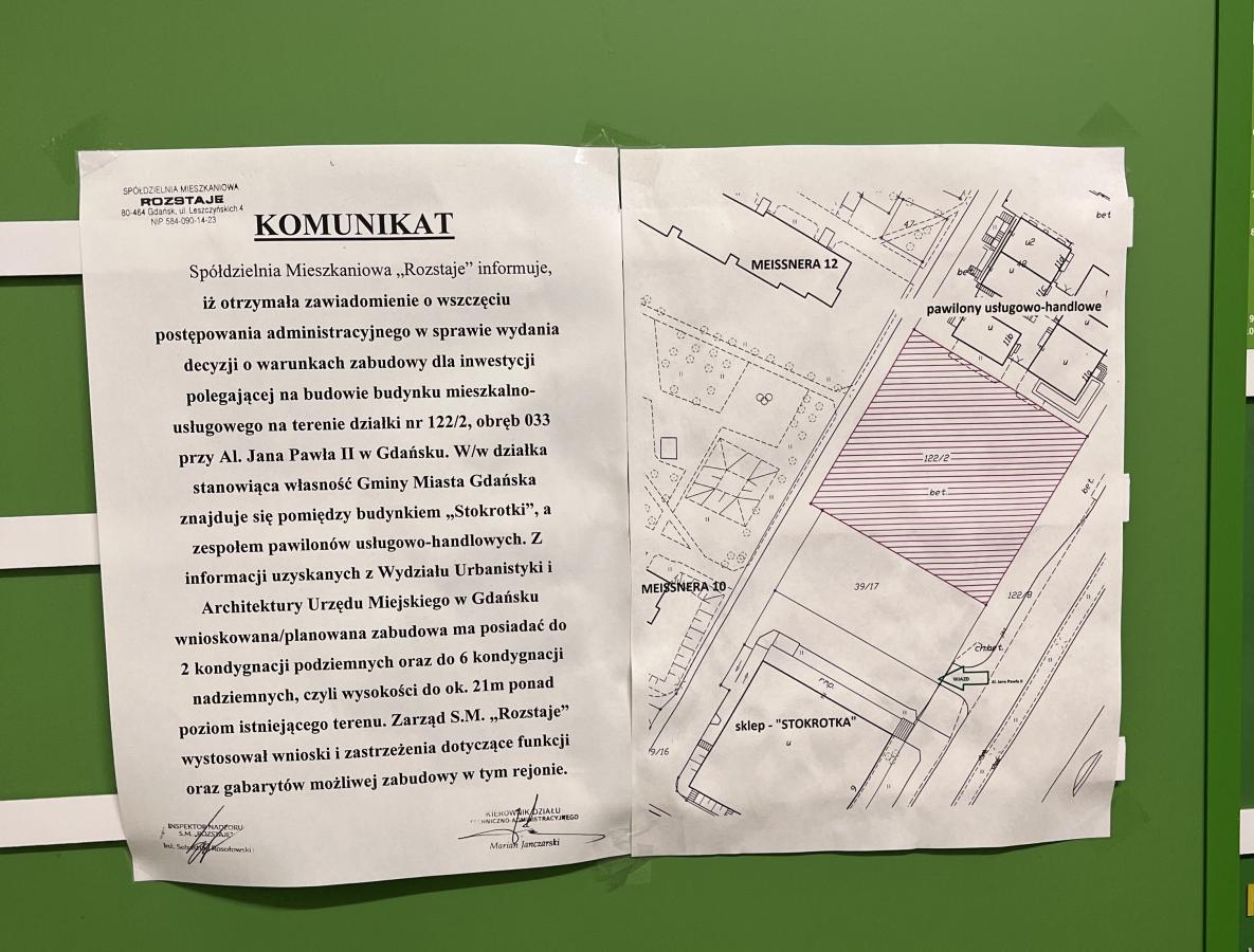 - S.M. „Rozstaje” informuje, iż otrzymała zawiadomienie o wszczęciu postępowania administracyjnego w sprawie wydania decyzji o warunkach zabudowy dla inwestycji polegającej na budowie budynku mieszkalno-usługowego - czytamy w komunikacie. - Działka stanowiąca własność Gminy Miasta Gdańska znajduje się pomiędzy budynkiem „Stokrotki”, a zespołem pawilonów handlowo-usługowych - informują przedstawiciele spółdzielni.